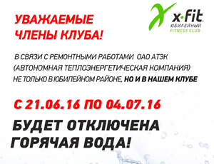 В связи с ремонтными работами в ОАО АТЭК (Автономная Теплоэнергетическая Компания) не только в Юбилейном районе, но и в нашем клубе c 21.06.16 по 16.07.16 будет отключена ГОРЯЧАЯ ВОДА!